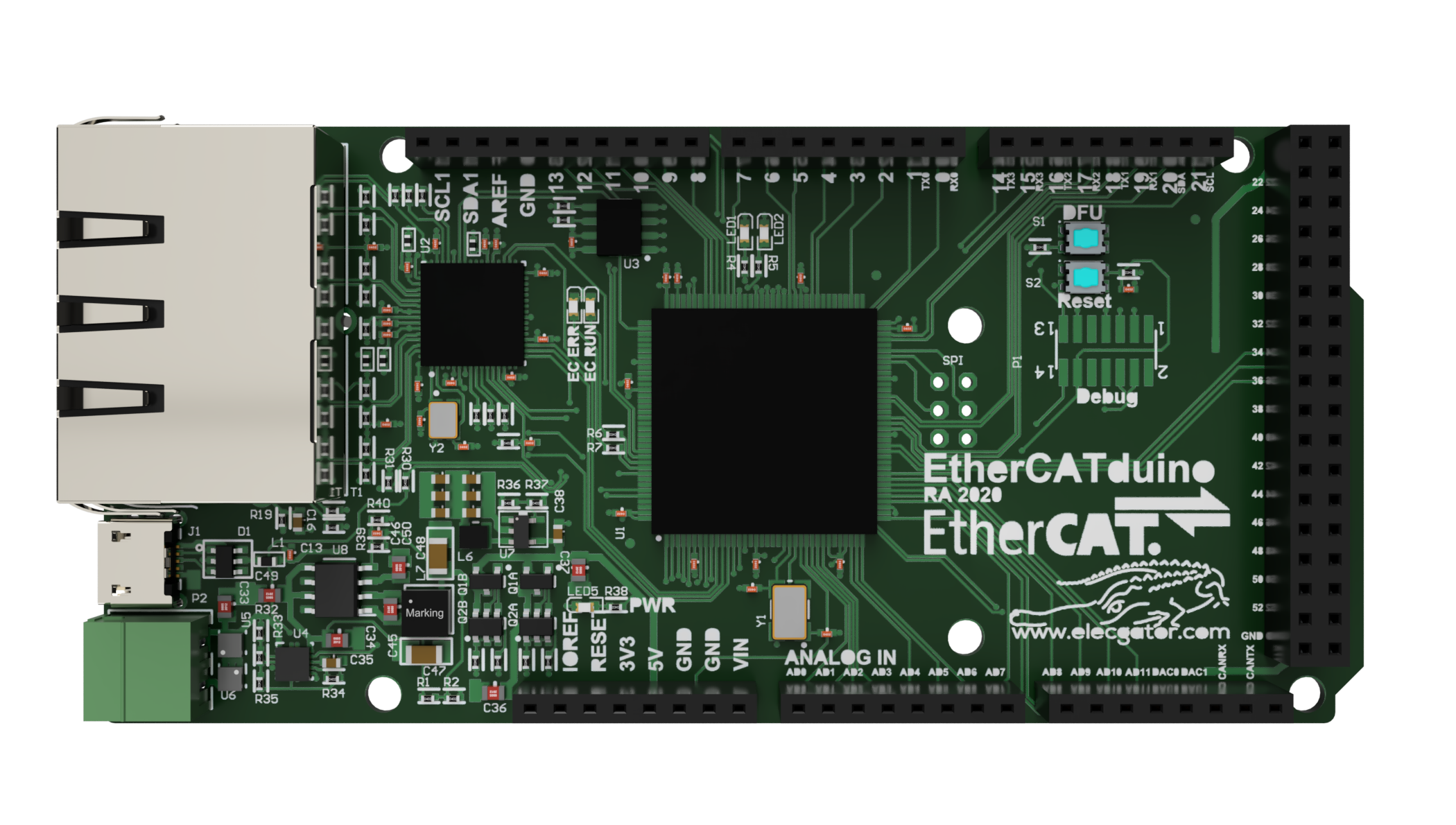 The EtherCATduino is designed to be compatible with the Arduino MEGA 2560. It has the same pinout and the same overall form factor. The EtherCATduino features a powerful ARM microcontroller, an EtherCAT interface, micro USB port and a DC input connector.