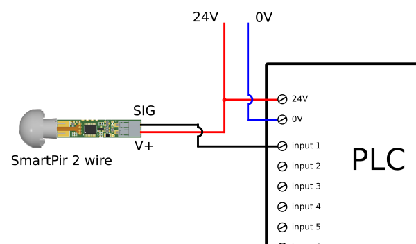 The smart mini motion sensor is "2-wire" connected to a 24V input type EN61132-2. Only two wires are required to power the sensor and also get the values off all measured environmental units. One wire connects 24V to the sensor, the other wire is the signal wire and is connected to the input of the controller as shown in the diagram.